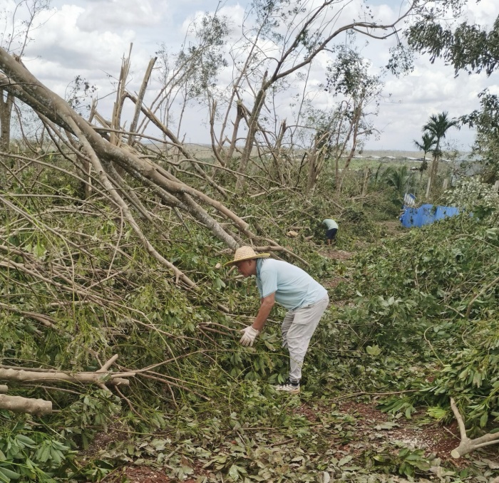 黑猪育肥部澄迈蔡氏猪场,符堆胜、吴芳众等人冒雨清理进场道路倒伏树木