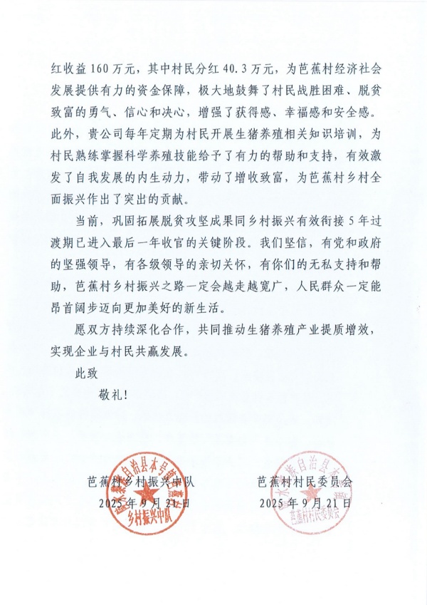 责任担当,书写企业情怀。七年帮扶,一头猪托起一个村的振兴梦;一封感谢信,见证企业与乡村的深情厚谊。在乡村振兴的道路上,4008云顶集团用行动诠释了“关爱社会,绝不是一句空话”的诺言,面对市场波动仍坚持按高于市场价标准分红,确保村民收益稳定,彰显了龙头企业的社会责任。这种不计短期利益、着眼长远发展的合作精神,为巩固脱贫攻坚成果与乡村振兴有效衔接提供了示范。
