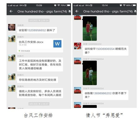 第一个群:员工群,群名:One hundred thousand pigsfarm。这个群包含生产、后勤全体员工,集工作、生活为一体。紧急重要的通知、生活的逸闻趣事都在这个群里发布,第一时间,所有人都能收到信息。今年台风突袭海南,时间紧急,为做好防台风工作安排,场长立即将防台风工作部署发到群里,各车间人员根据安排马上执行,在最短时间内做好防台风的措施,以确保安全的前提下,各车间正常生产运行。这个群里还充满了温馨与笑语,情人节之际,场里举办七夕活动,夫妻们和情侣们纷纷上传合照到群里“秀恩爱”,此刻的员工群充满了浓浓的爱意。群里的酸甜苦辣让员工们有了更强的归属感。