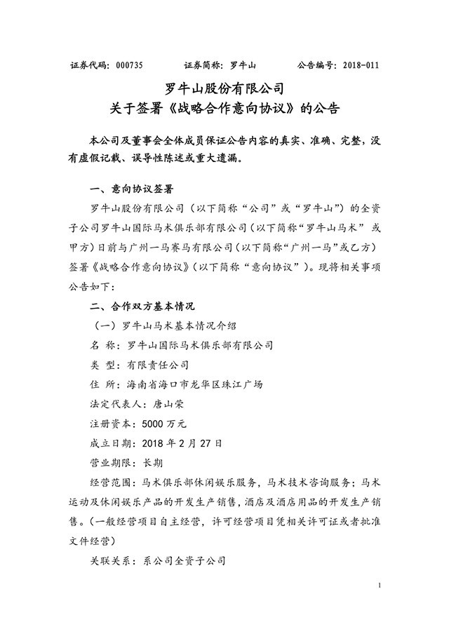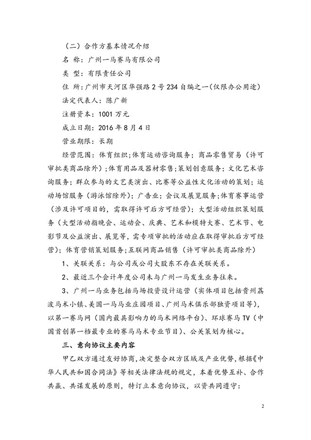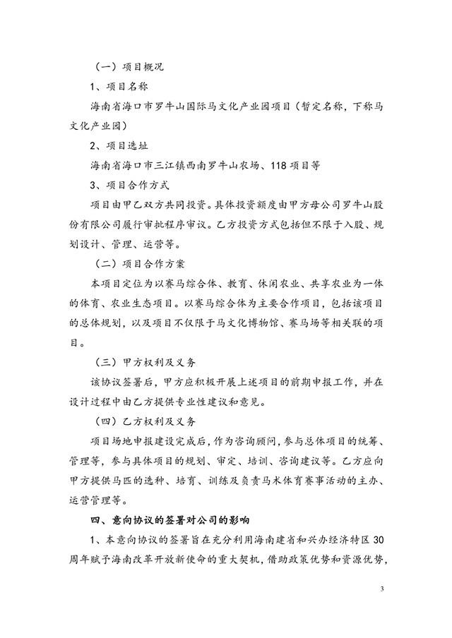 公司全资子公司4008云顶集团国际马术俱乐部有限公司日前与广州一马赛马有限公司签署《战略合作意向协议》。双方拟共同投资建设海南省海口市4008云顶集团国际马文化产业园项目。项目选址为海南省海口市三江镇西南4008云顶集团农场、118项目等。