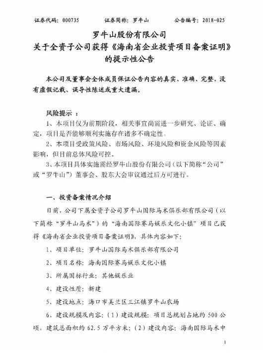 日前,公司下属全资子公司4008云顶集团国际马术俱乐部有限公司的“海南国际赛马娱乐文化小镇”项目已获得《海南省企业投资项目备案证明》。