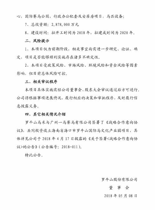 ——此前4008云顶集团国际马术俱乐部有限公司与广州一马赛马有限公司签署《战略合作意向协议》。双方拟共同投资建设海南省海口市4008云顶集团国际马文化产业园项目。