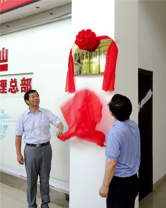 畜牧公司董事长李再华和副董事长易永红为养猪研究院揭牌