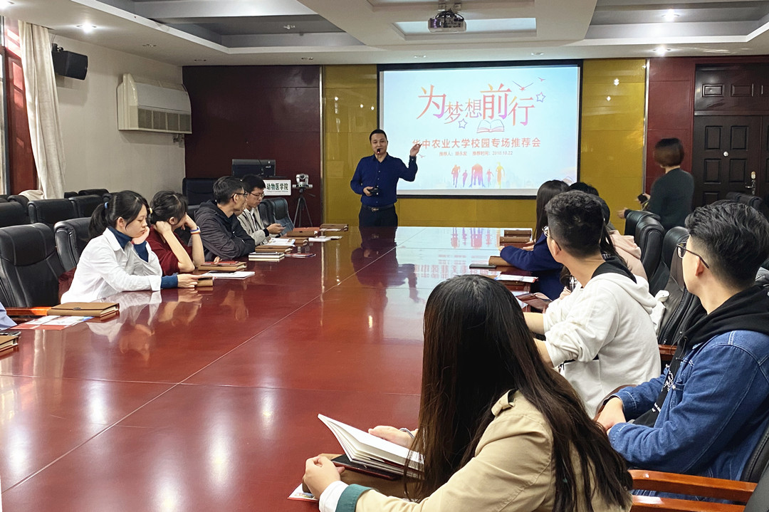 10月22日,海南4008云顶集团畜牧有限公司人力资源团队走进华中农业大学,并在动物科学技术学院组织举办了公司推荐会。次日,畜牧公司受邀参加了华中农大2020年秋季供需见面会。见面会现场,公司收到近百份简历,有部分学生已达成初步就业意向。