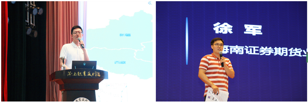 图说:海南证监局的李芃树老师(左)向同学们介绍了活动背景、赛程安排、参与方式、获奖机制等内容;海南证券期货业协会的徐军老师(右)向同学们详细讲解了竞赛规则及答题技巧。