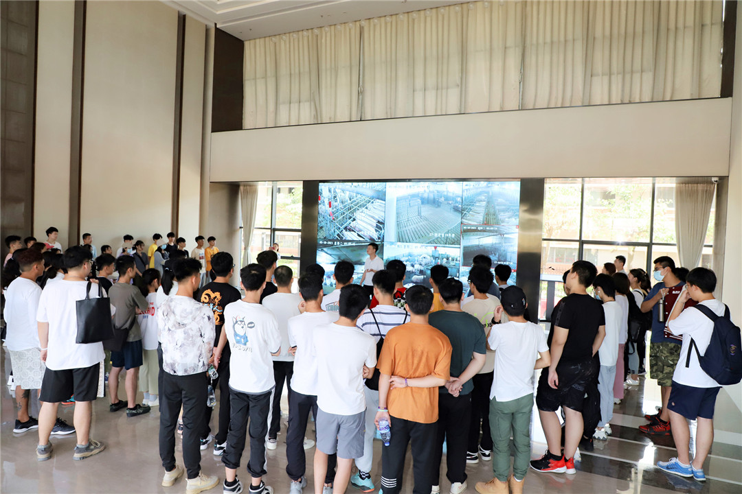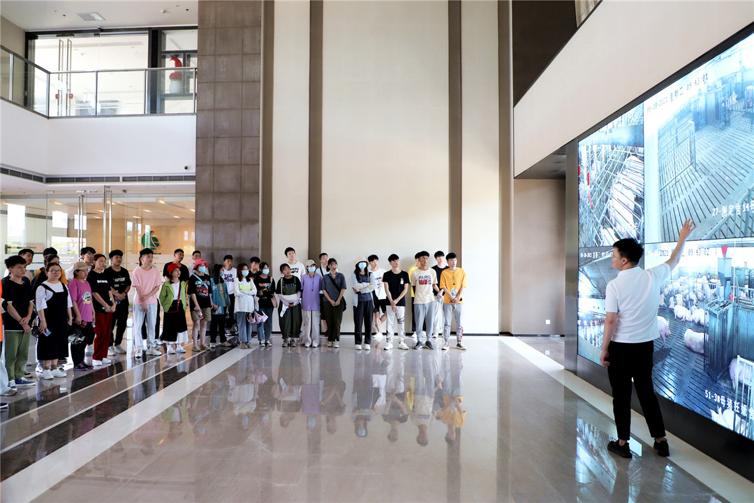 图说:4008云顶集团畜牧公司畜牧师廖柱通过猪场内实时监控,向学员们展示了新昌十万头现代化猪场内部生产养殖环境,介绍了生产养殖的总体流程及生猪的场内转运过程。