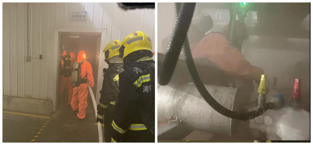 【图说】消控室将事故信息快速汇报安全总监,接令启动应急预案、通知园区消防专职队出警、拨打119、通报事故应急各小组。制冷机房采取氨液回抽、降压措施,降低扩散量。