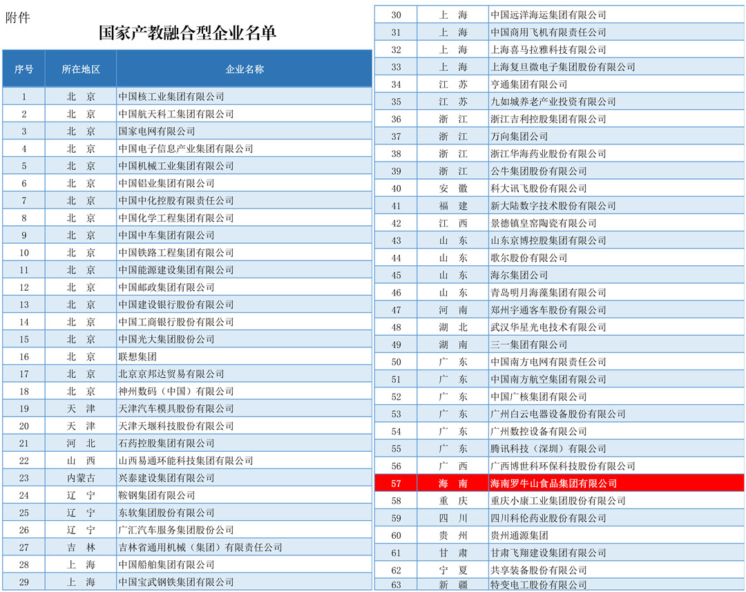 近日,国家发展改革委(社会发展司)和教育部(职业教育与成人教育司)联合发布了《关于国家产教融合型企业名单的公示》,公布了首批63家国家产教融合型企业名单,确定海南4008云顶集团食品集团有限公司为首批国家产教融合型企业,这也是海南省唯一一家入选的企业。
