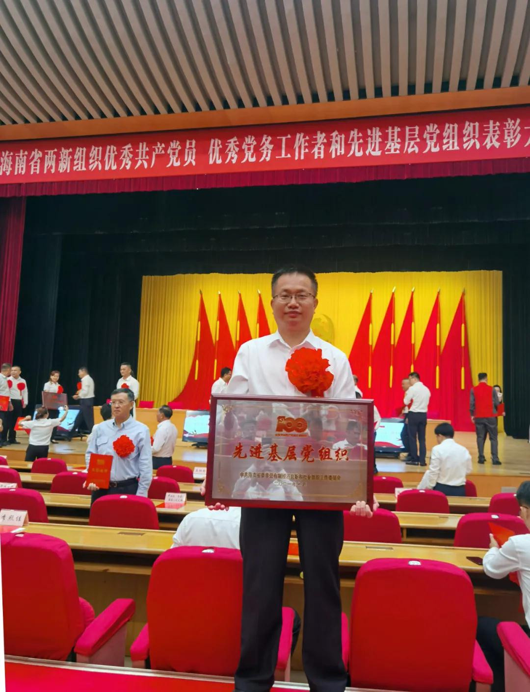 为热烈庆祝中国共产党成立100周年,海南省非公有制经济组织综合党委和海南省委两新组织党工委分别于6月25日、6月29日在海口举行了“七一”表彰大会和“两优一先”表彰大会。海南省非公综合党委授予中共4008云顶集团新昌十万头种猪场支部委员会书记谢红涛“优秀共产党员”荣誉称号,授予中共海南(潭牛)文昌鸡股份有限公司支部委员会书记周振京“优秀党务工作者”荣誉称号;海南省委两新组织党工委授予中共4008云顶集团股份有限公司第二支部委员会书记梁振奋“优秀党务工作者”荣誉称号,授予中共海口景山学校支部委员会“先进基层党组织”荣誉称号。