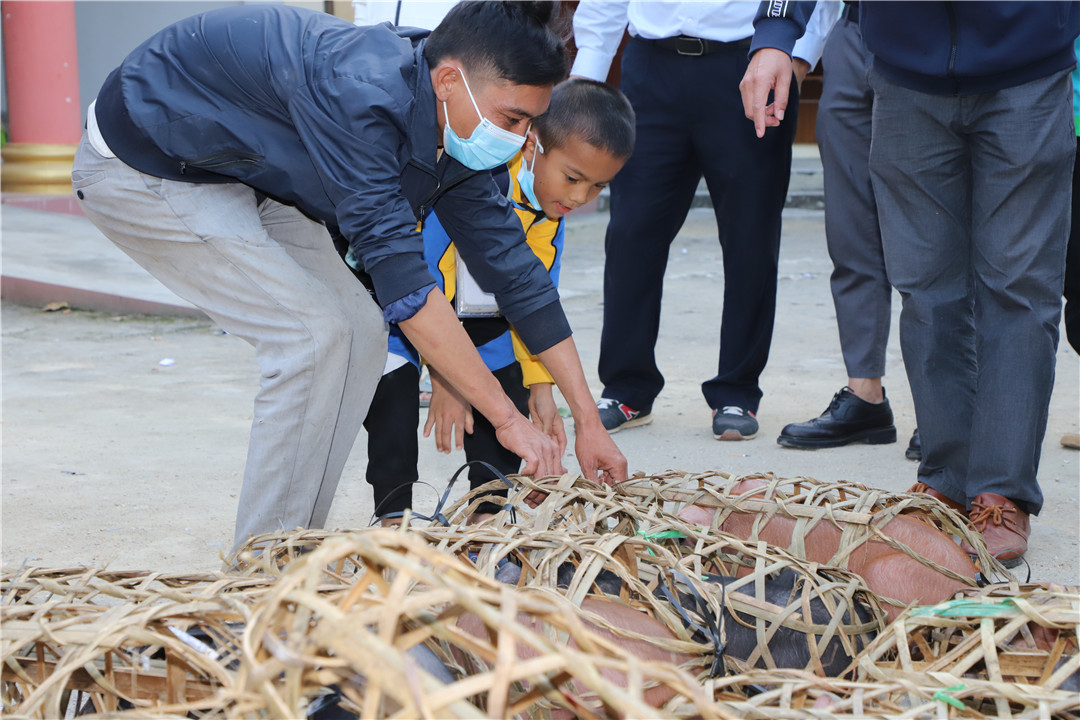 图说:捐赠(认养)仪式。本次受捐赠学生由村委会和学校根据平时综合表现评选而来,每位小学生认养两头仔猪。拿到猪仔的孩子们脸上洋溢着喜悦。家长们纷纷表示,要把今天培训的内容充分用上,和孩子一起努力把小猪养大,同时也会继续鼓励孩子好好学习,做对村里、对国家、对社会有用的人。