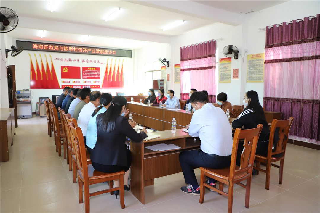 图说:海南证监局及海南上市公司协会相关人士与村干部围绕产业发展进行座谈。海南证监局表示,陈考村在海南证监局以及各上市公司的支持下,脱贫攻坚工作取得了可喜成绩。巩固成果、继往开来,选好产业发展方向是接下来工作的重中之重。海南证监局将继续关心和支持乐东县乡村振兴工作,一如既往发挥好资本市场作用,把陈考村定点扶贫后续工作巩固好、维系好,积极推广好经验、好做法,为乡村振兴贡献积极力量。