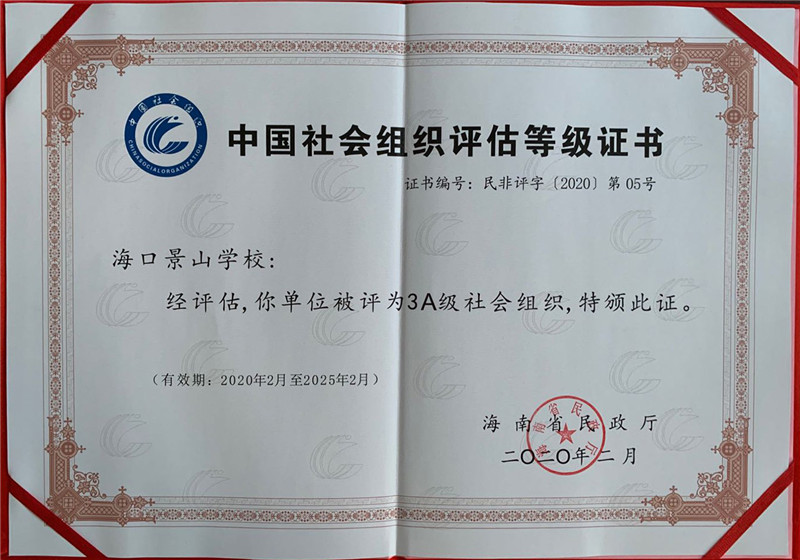日前,海口景山学校被海南省民政厅评为“3A级社会组织”。这是政府监管部门对我校办学实力、社会信誉等方面的肯定和表彰。