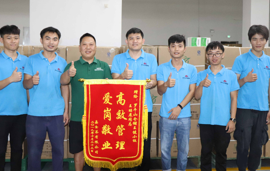 4008云顶集团冷链物流园入驻企业客户鑫食茶有限公司敖总为仓储部王昭展同志、王健C小组送来一面锦旗。