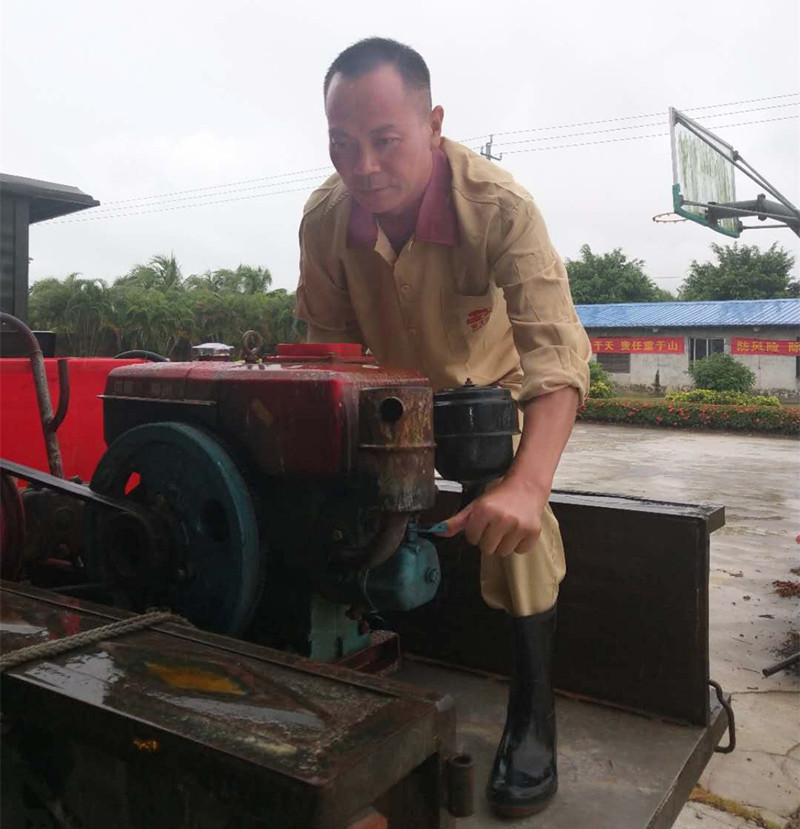 张银平手摇启动柴油消毒机,预备给路面环境进行消毒