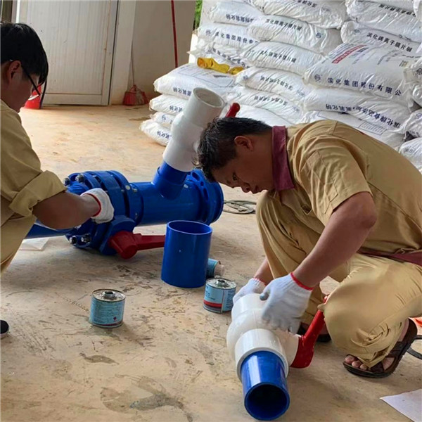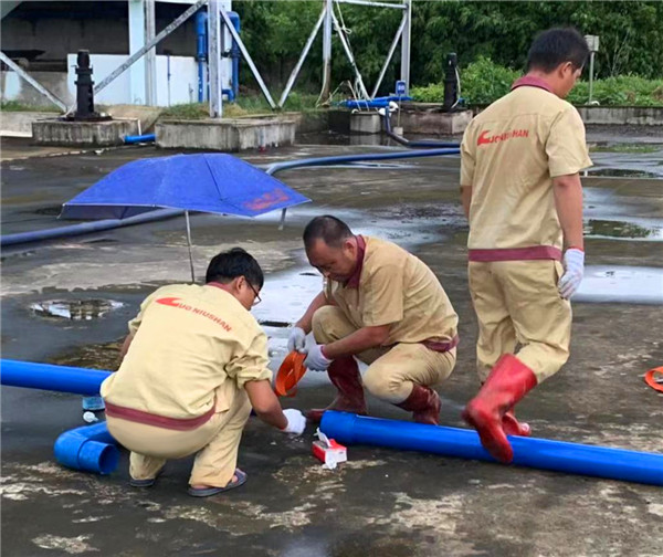 图2:安全与设备管理部的小伙伴们正在用胶水对管道进行连接,施工过程中突然下起雨,为保证胶水粘黏效果,他们撑起伞遮住管道连接处,全然不顾自己被雨水淋湿。