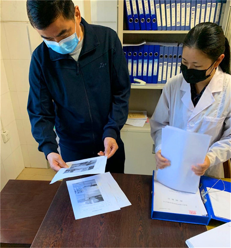 图4:总务处负责人刘少雄正在医务室检查学校消毒防疫登记建档情况。