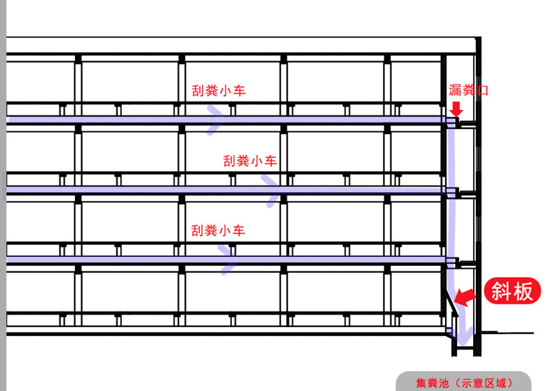 高层楼房养殖,各层猪只产生的粪便,通过刮粪小车定向刮往一级粪沟末端,猪粪从高层漏粪口自由落体式下落,最终由二级粪沟刮粪小车刮入末端集粪池中。