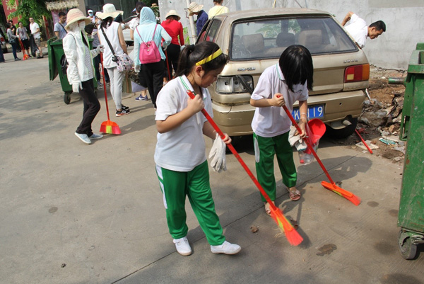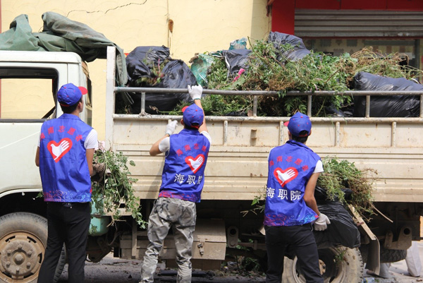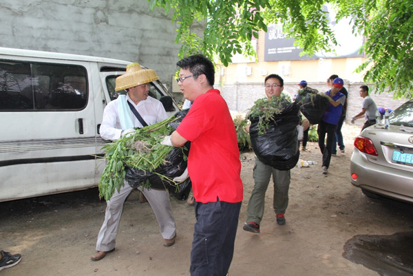 志愿者们头顶烈日,手持铁铲、锄头、扫把一同清理卫生死角,