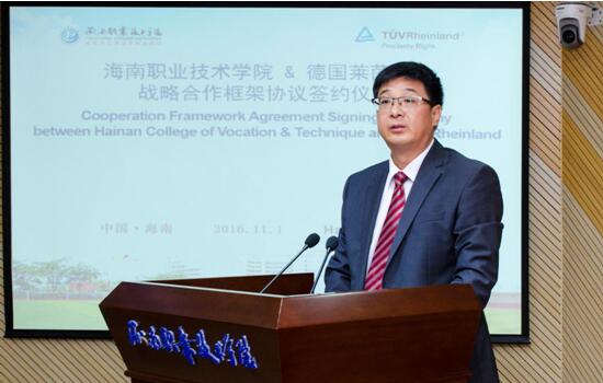校长王安兴在致辞中表示,海职院能与在国际上享誉盛名的德国莱茵进行深度合作,无疑是对学校以往的办学成绩、办学实力的充分肯定和信赖。这是职业教育和企业发展共进、优势互补、资源共享、工学结合的一个新的典范,也是学校不断创新人才培养模式,加快技术技能型人才培养步伐的有益实践和重要举措。